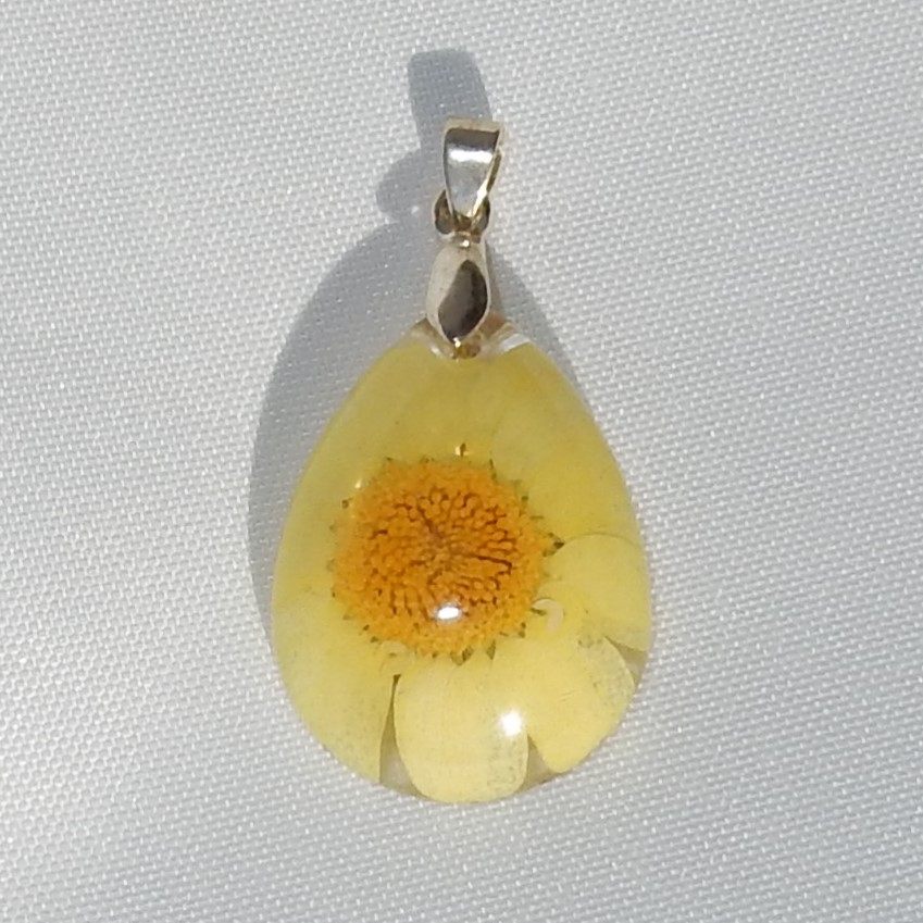Anheng Dråpe i klar resin, med en tørket gul blomst.