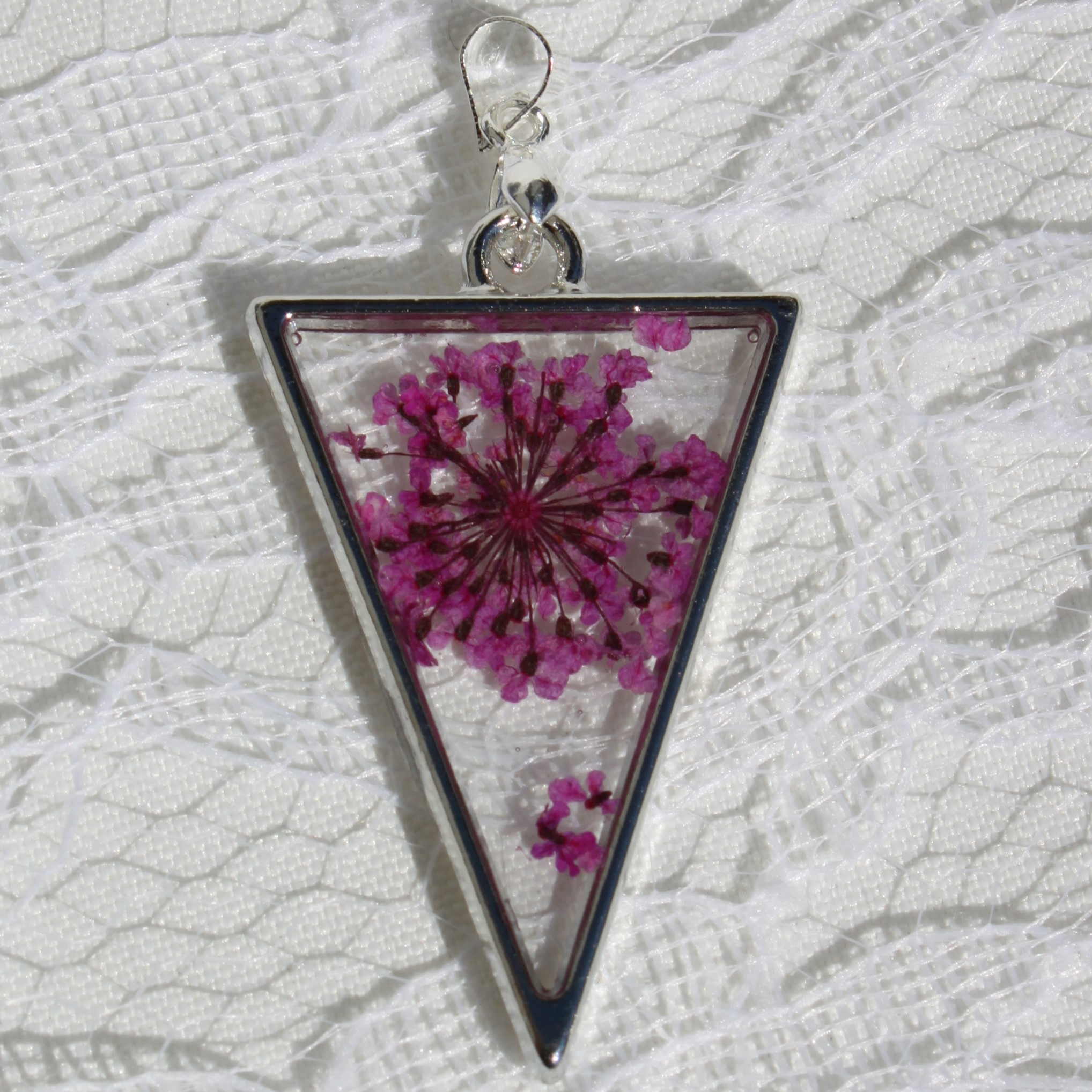 Anheng med sølvfarget trekantramme, med lilla blomst i klar resin.