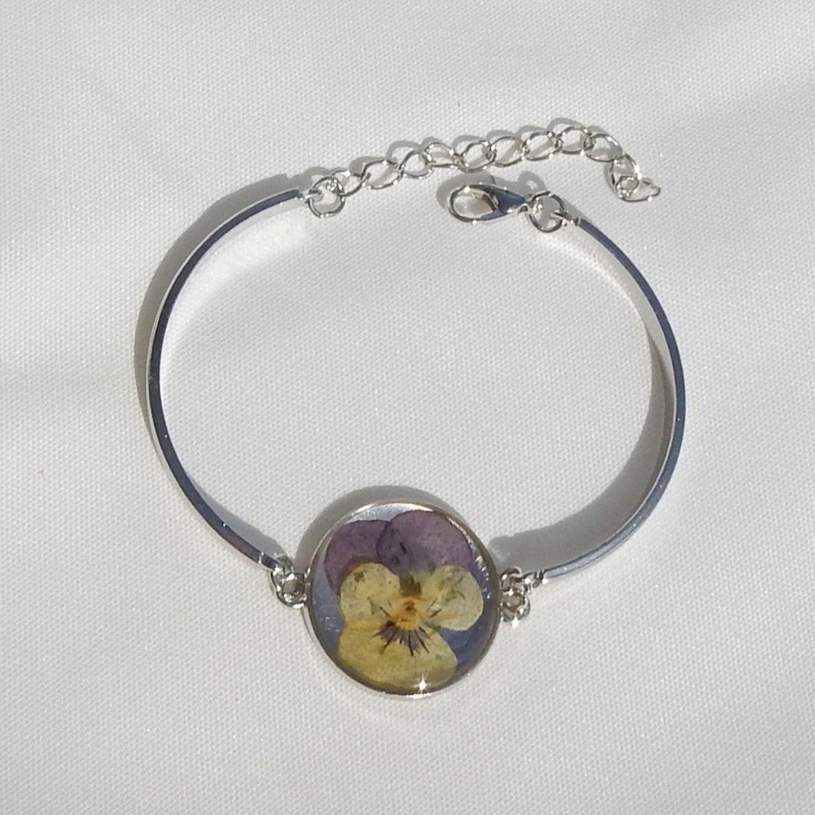 Armbånd Delt i sølvfarget metall, med en tørket mini stemors blomst i klar resin.
