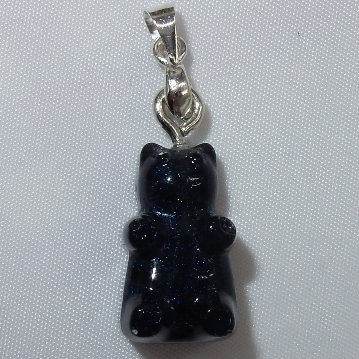Gummibjørn Anheng Lite i blåsort resin, har sølvfarget ring for kjede.
