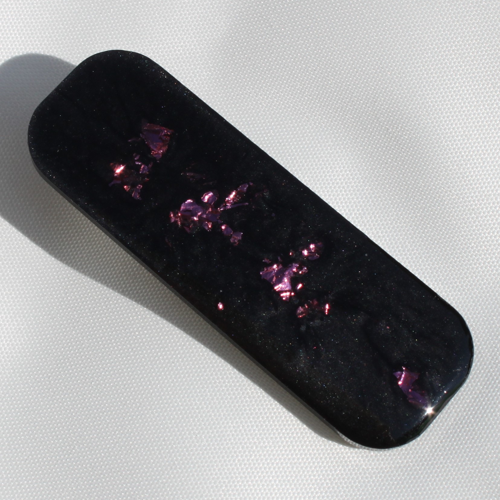 Hårspenne Rektangel i sort resin, med rosa glitterflak.