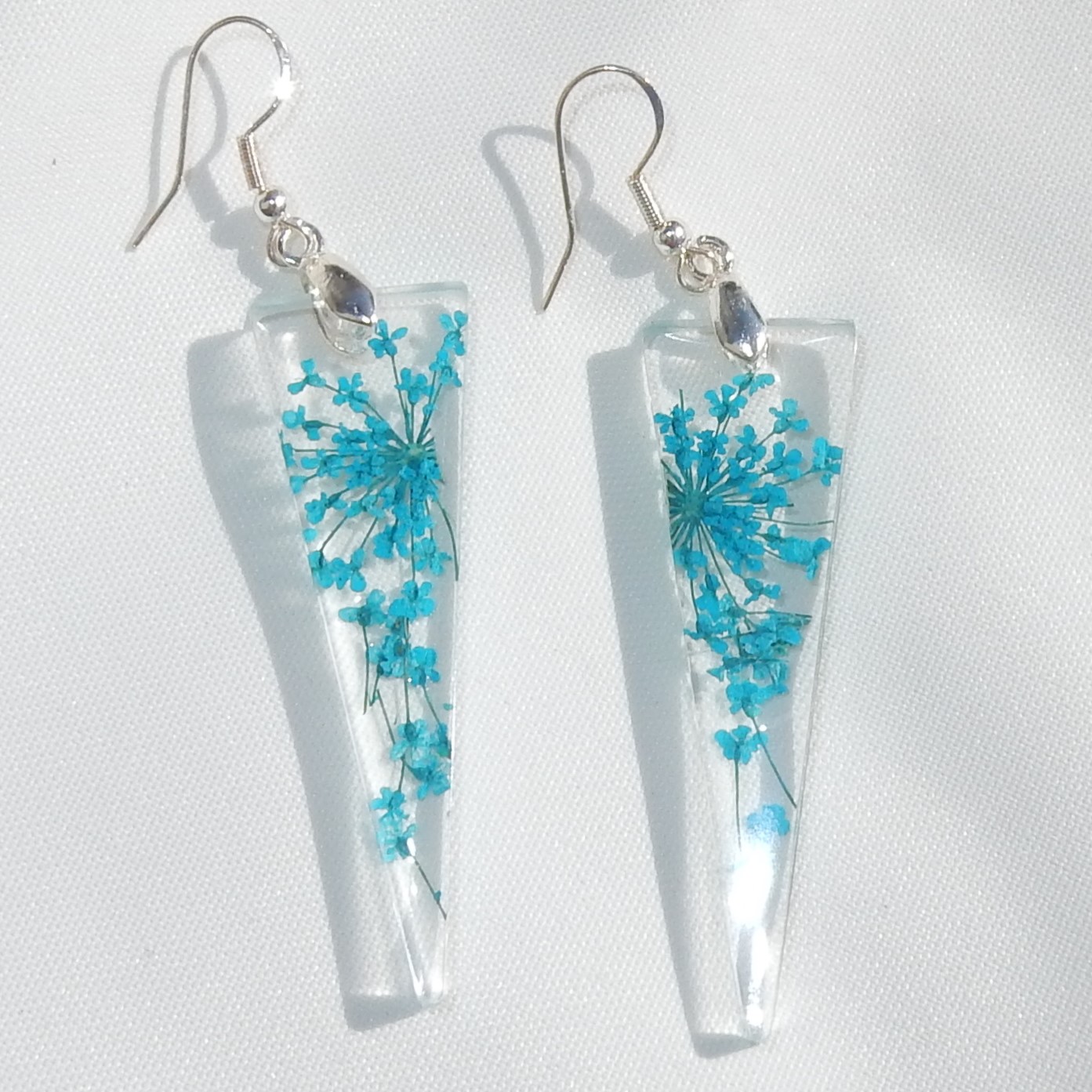Øreringer Trekant Stor med tørkede turkise blomster i klar resin, har ringer i ekte sølv.