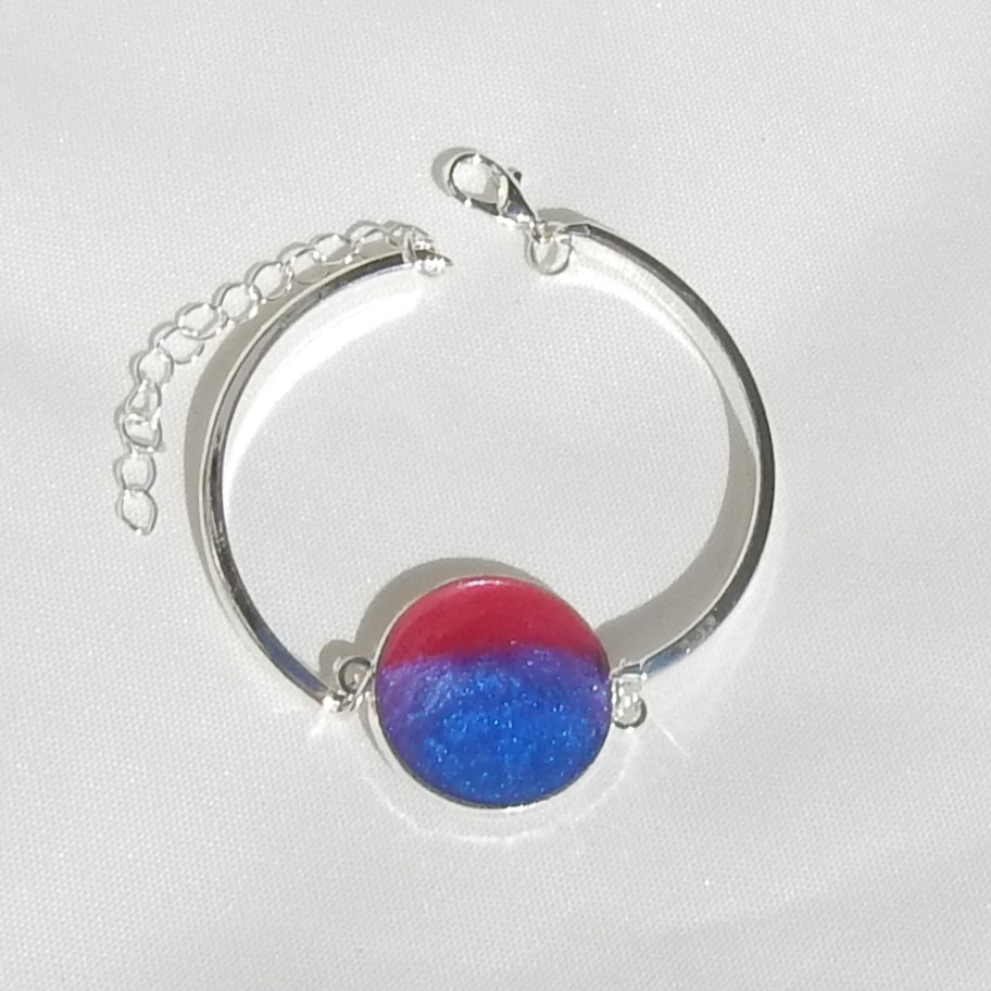 Pride armbånd med rosa, lilla og blå resin, i sølvfarget metall.