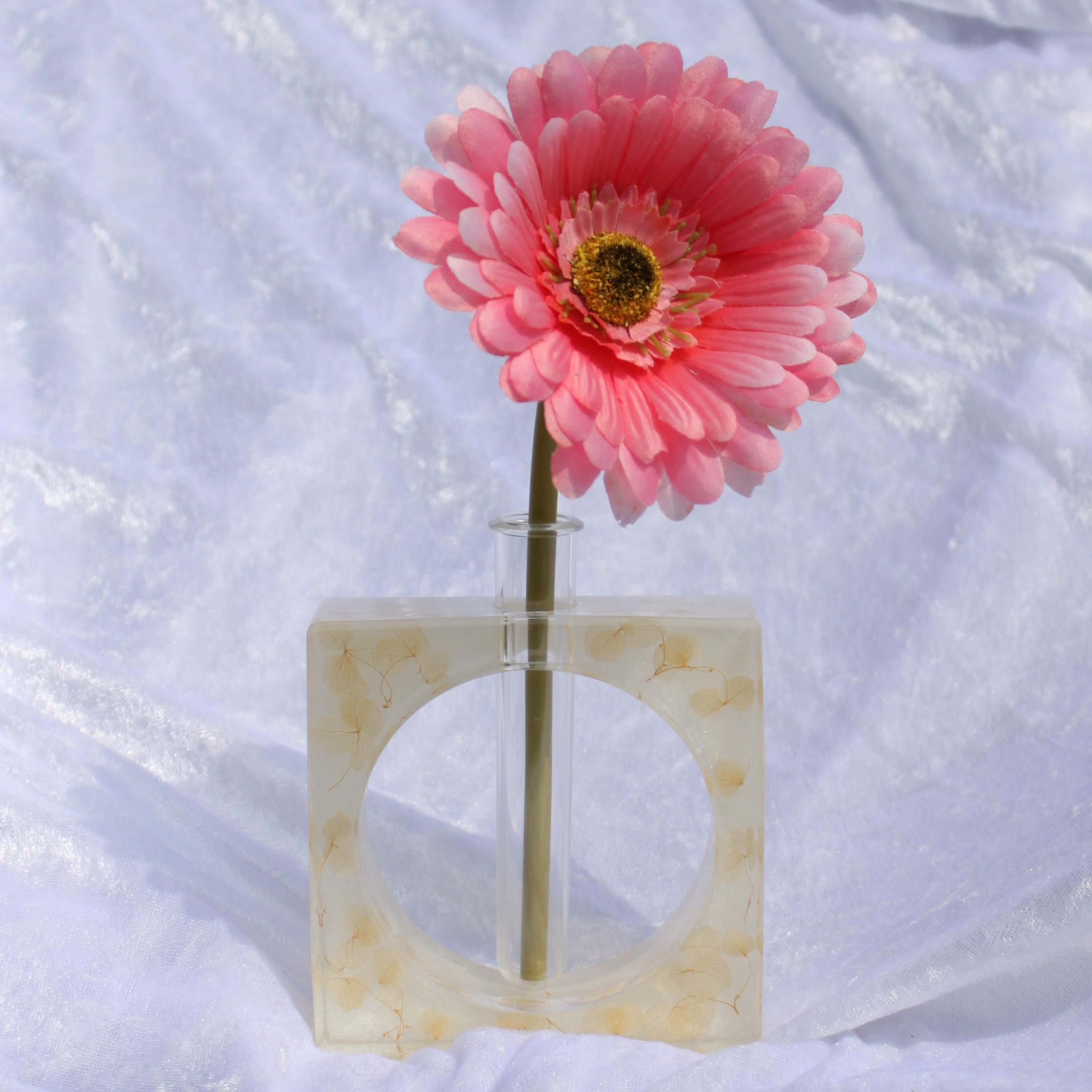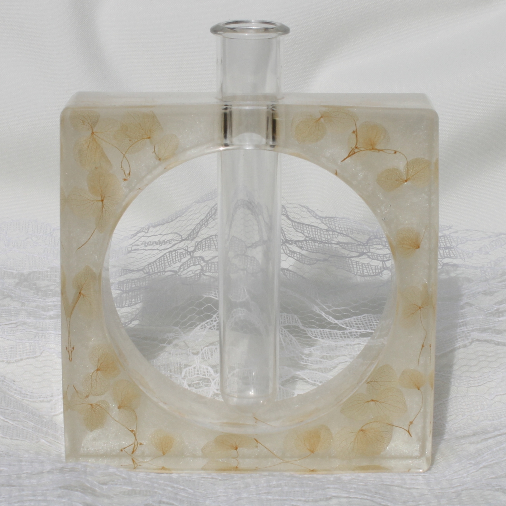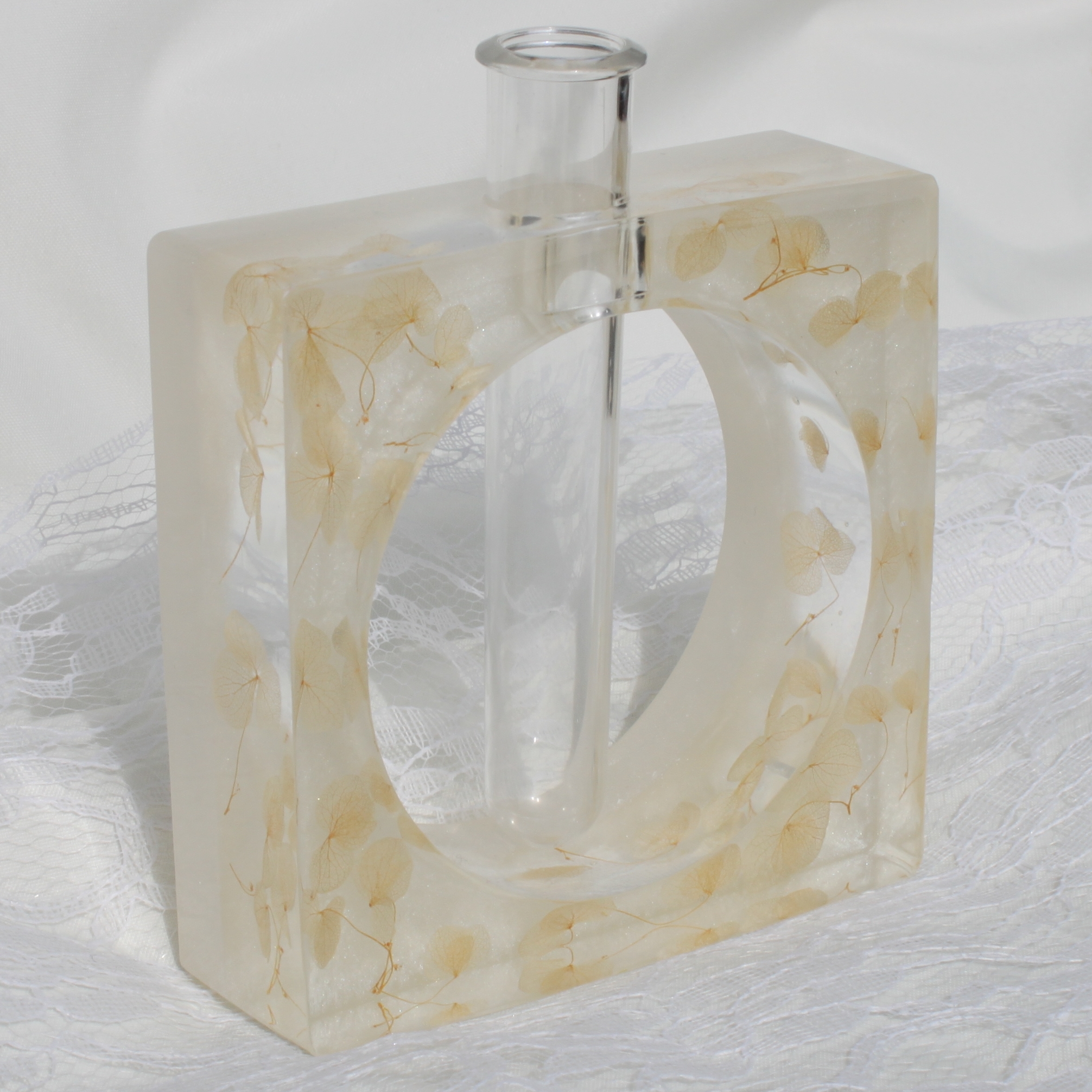 Vase Firkant med ferskenfargede tørkede blomster i klar resin, med hvit bakgrunn.